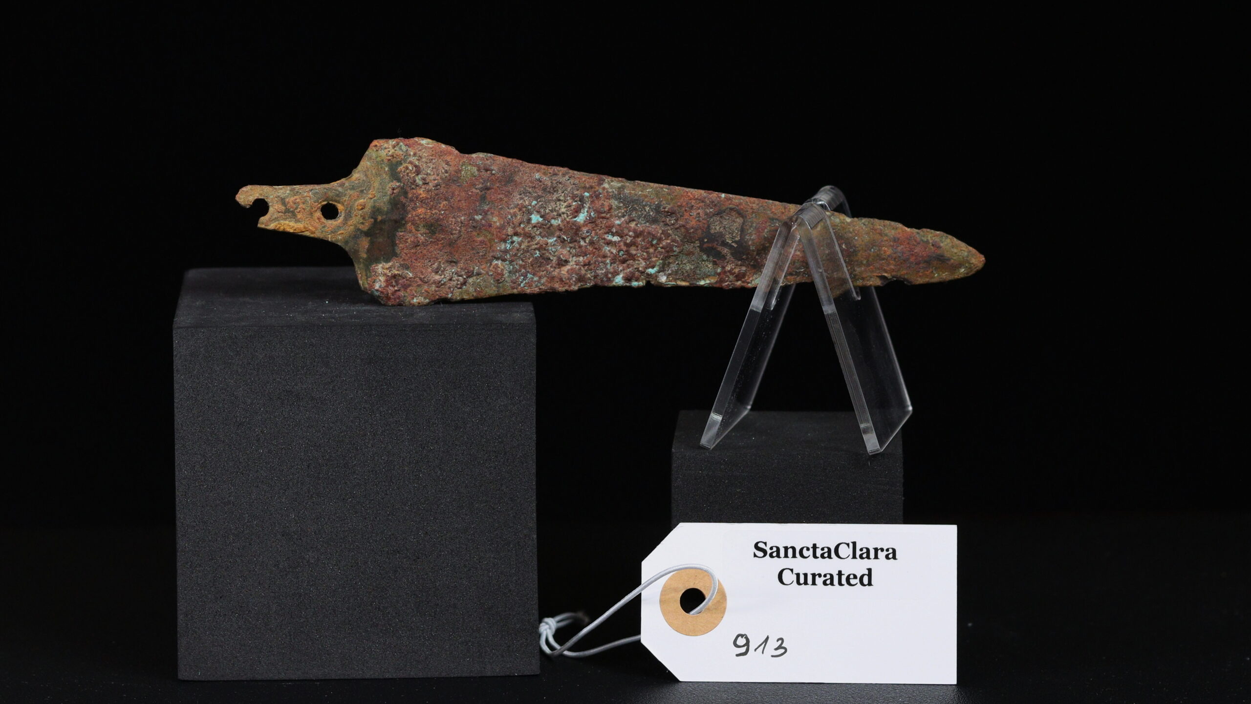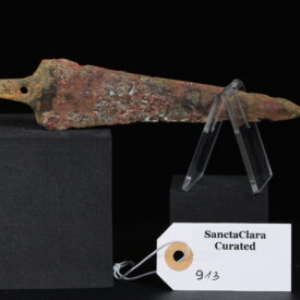 Copper alloy dagger blade, Mediterranean, Near East. 2 rivet holes. Round wide hilt mark visible. Reddish patina indicates minimal iron content. Nonmagnetic.