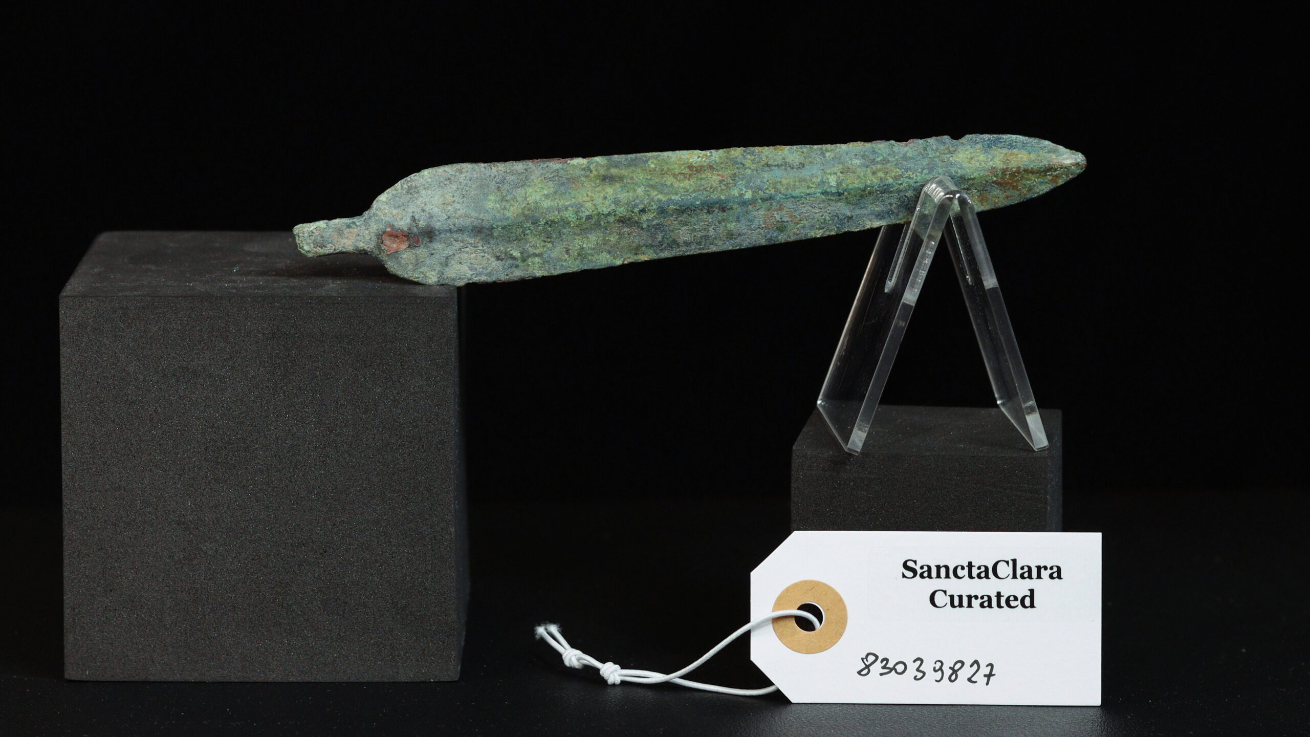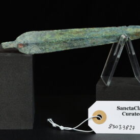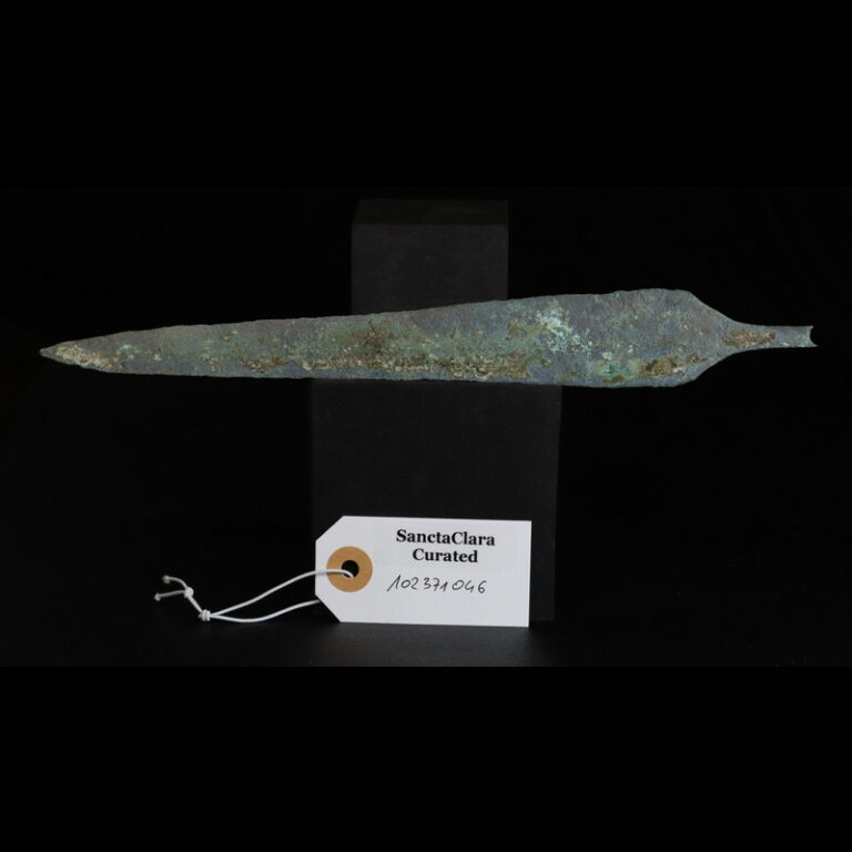 A finely cast and hammered copper alloy blade. The piece features a long leaf-shaped blade with a central midrib, and a short, flattened, broken tang. The surface is covered with very thick azurite patination with some earth encrustations remaining. There are some small chips along the edges of the blade and the surface. Copper blade with extremely thick mineral patina in layers, first crystalized red patina, later green malachite and blue azurite patina. Metal almost entirely mineralized, only a few millimeters of the core left. Before 1600 BC. Alloy with minute iron content, lightly magnetic