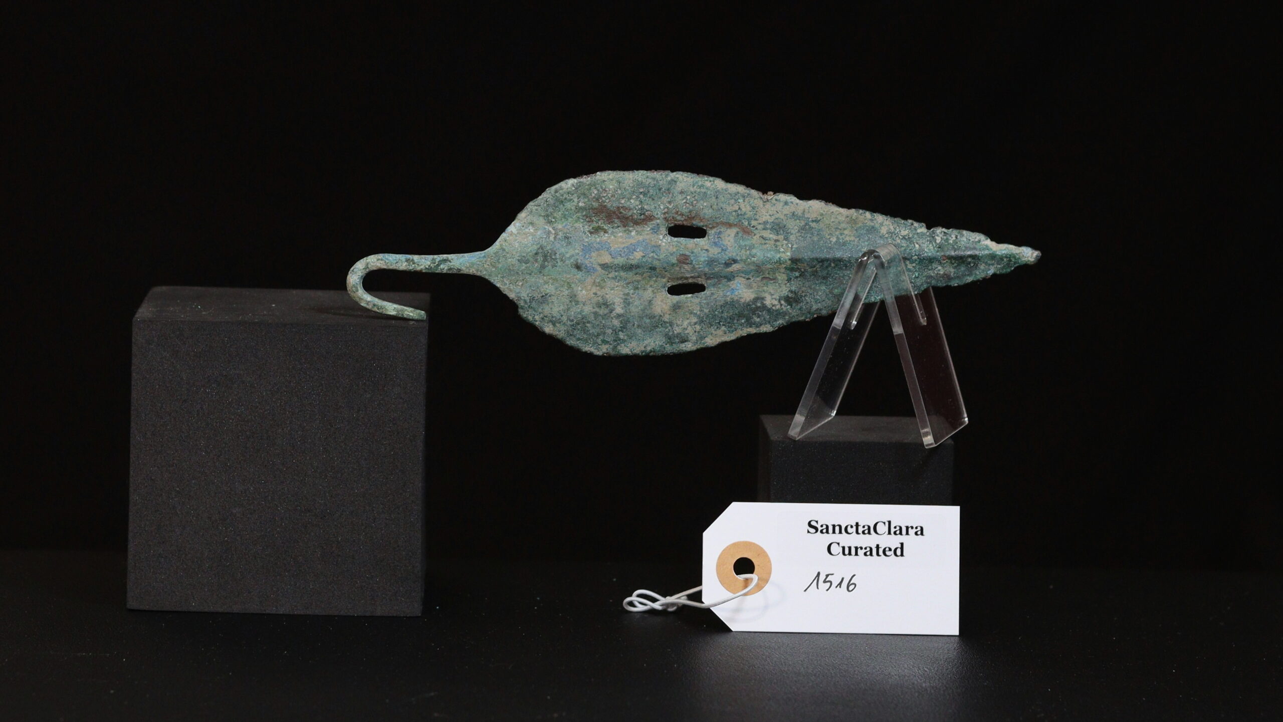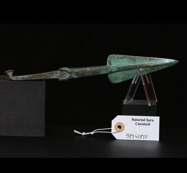 This early copper spearhead predates the widespread adoption of bronze in the Aegean. Pure copper weapons are softer and more prone to bending than bronze, which drove the search for harder alloys.