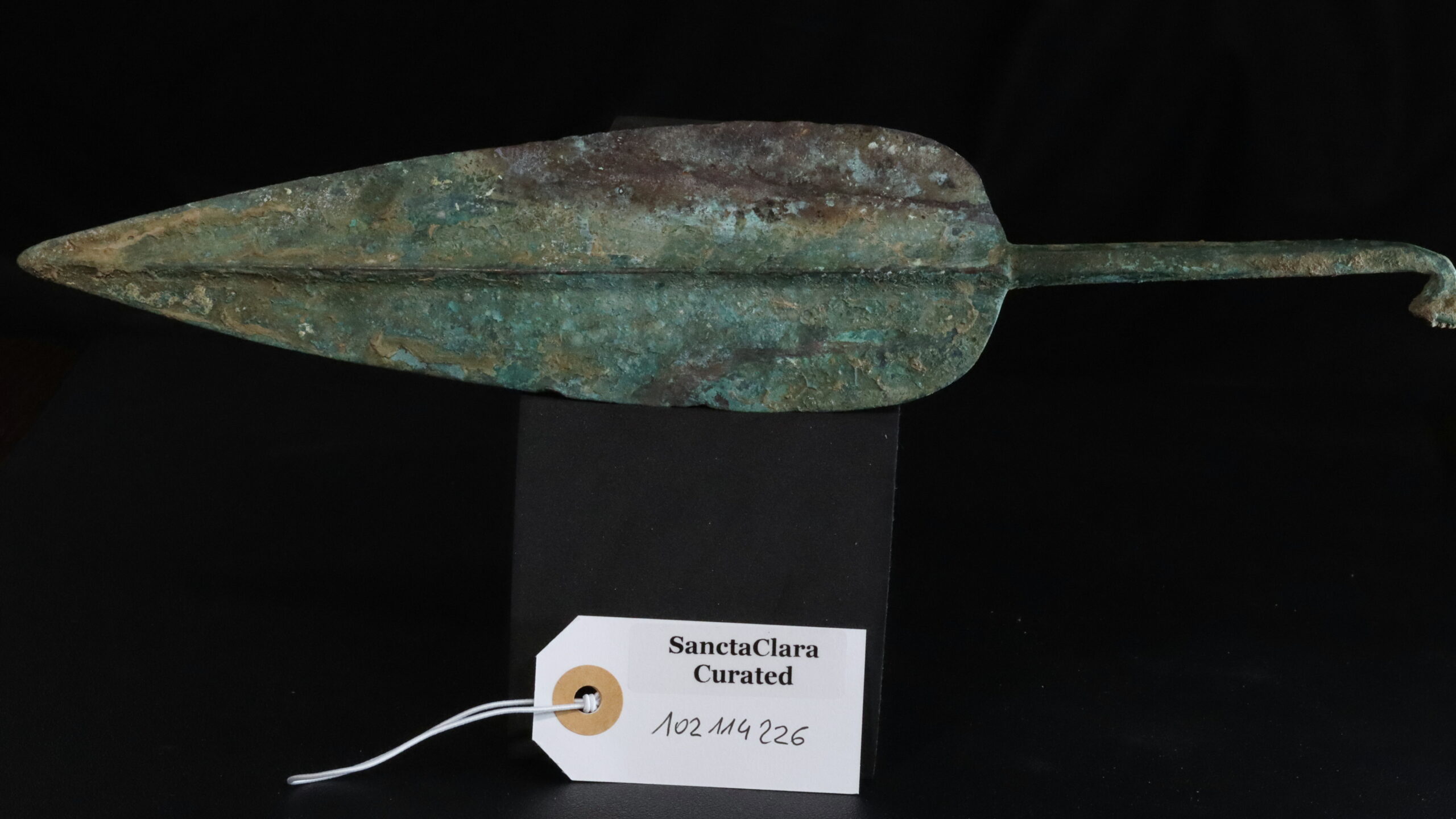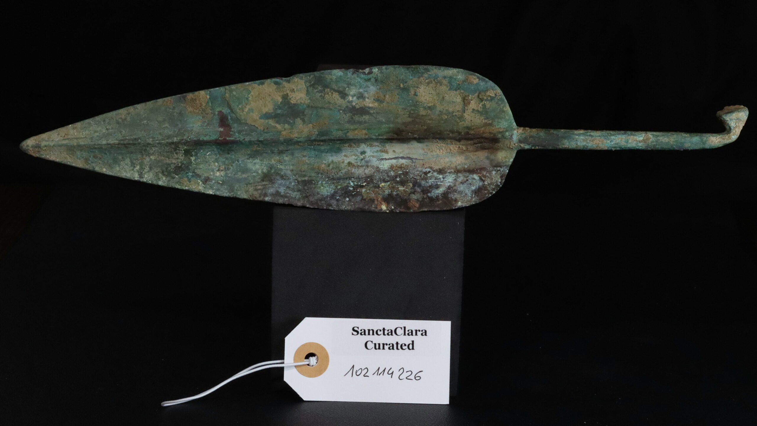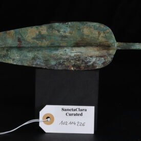 Strong tang with hook tail hammered into a rivet head shape. One blade bears signs of bend damage. Early Cypriot Hook-Tanged Bronze Spearhead