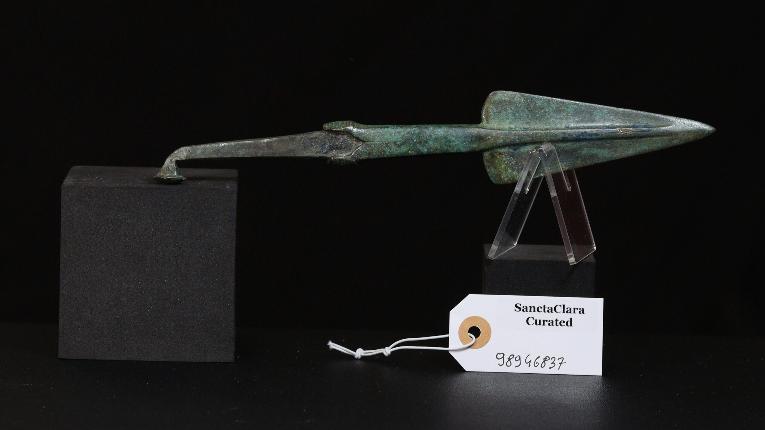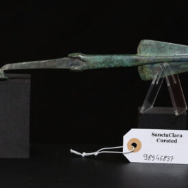 An exceptionally sturdy spearhead cast in one piece. Triangular blade with wide flat midrib and wide square shoulders. The shoulder flanges are decorated with incised stripes (skeuomorphism). A strong neck ends in a splayed decorative stop-ridge. The tang terminates in a hammered spherical 'button-ended hook' for secure hafting.
