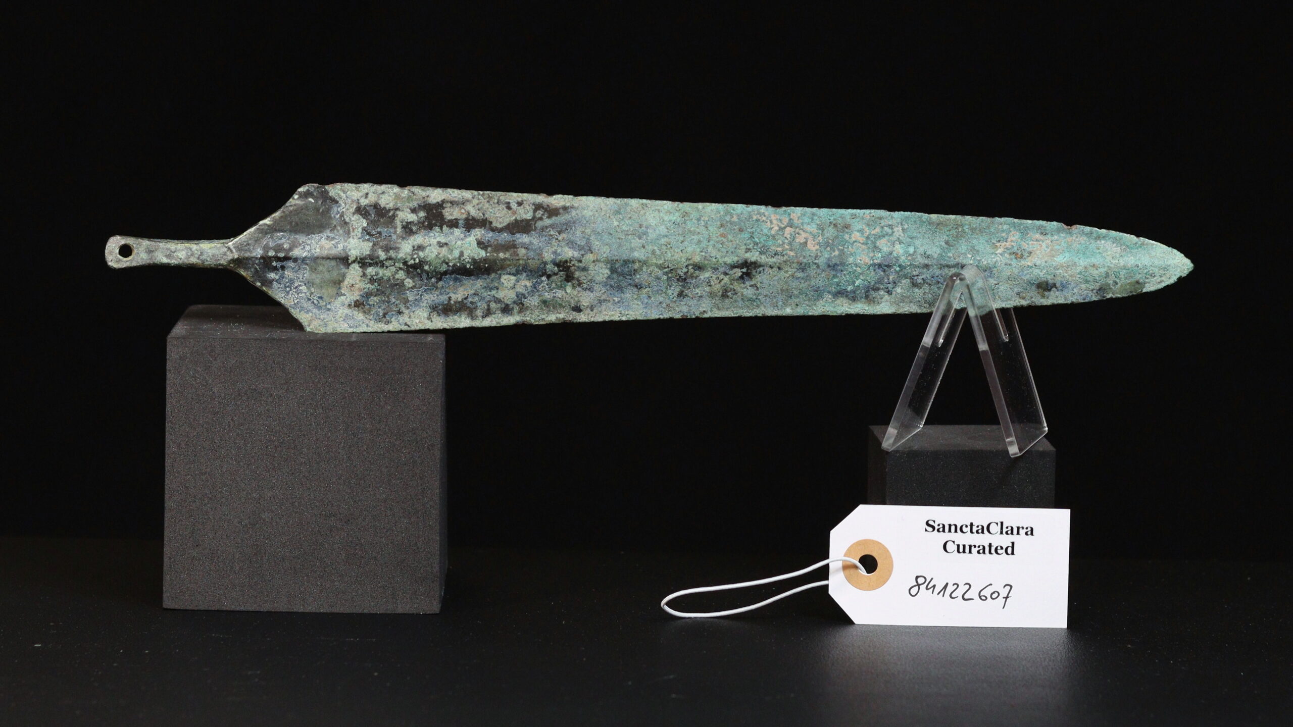 A stunning condition Bronze Age Bronze Sword or dagger blade with a strong central ridge and one rivet loophole at the end of a short tang. Trapezoidal, thick blade cross-section with round hilt mount shadow visible. Blade slightly concave in shape, with magnificent obsidian black, vitreous shiny chalcocite and cassiterite patina. Blade grinded and meticulously polished to perfection after being cast in antiquity. Original length with organic hilt estimated at 420 mm.
