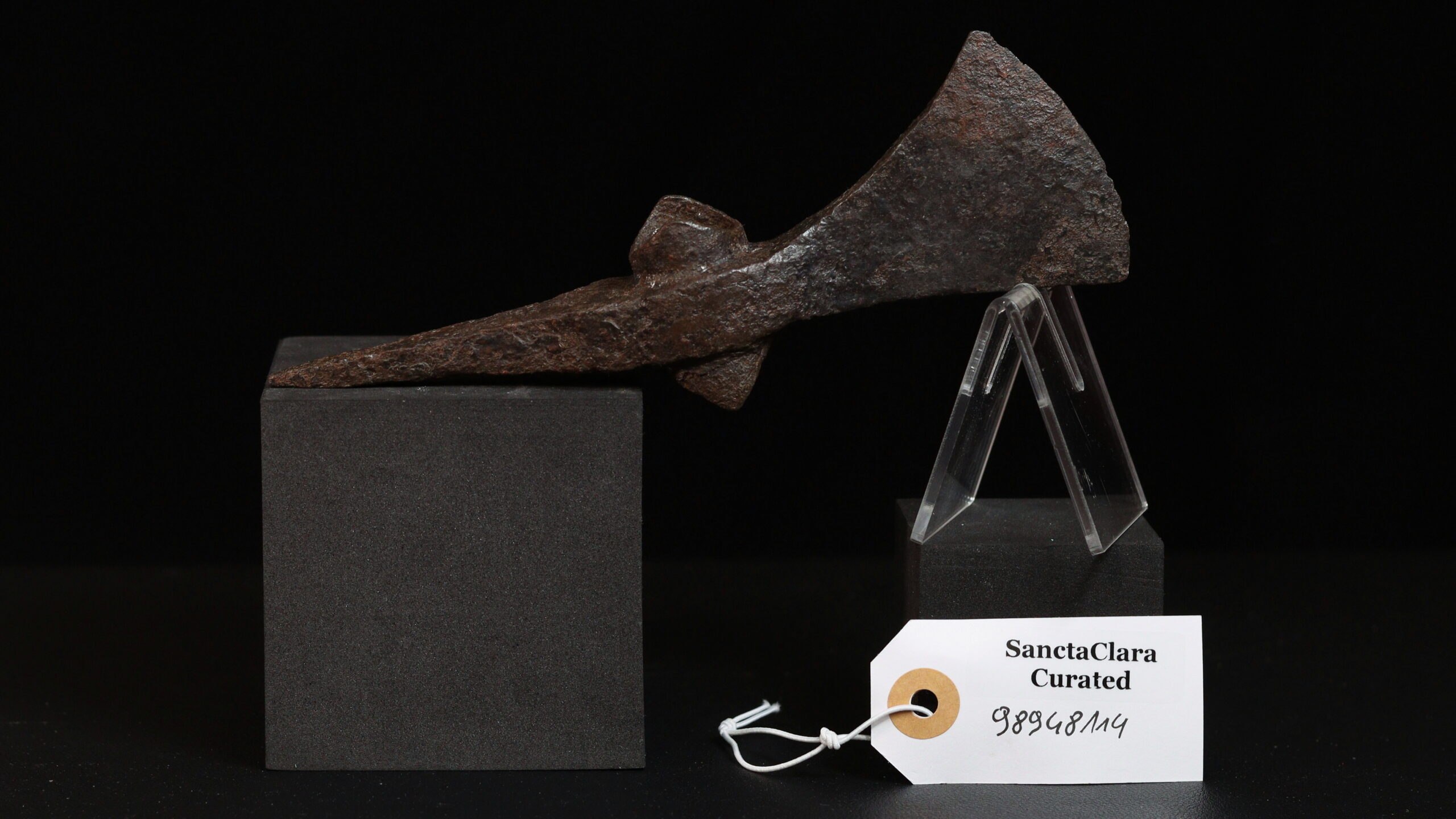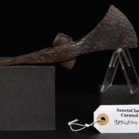 This impressive iron axe--adze head features a broad flaring axe blade on one side, the opposite arm forged as a long, tapering adze/pick with a straight back and acute point, a thick central body with an oval hafting eye and paired lugs above and below. Sagaris type.
