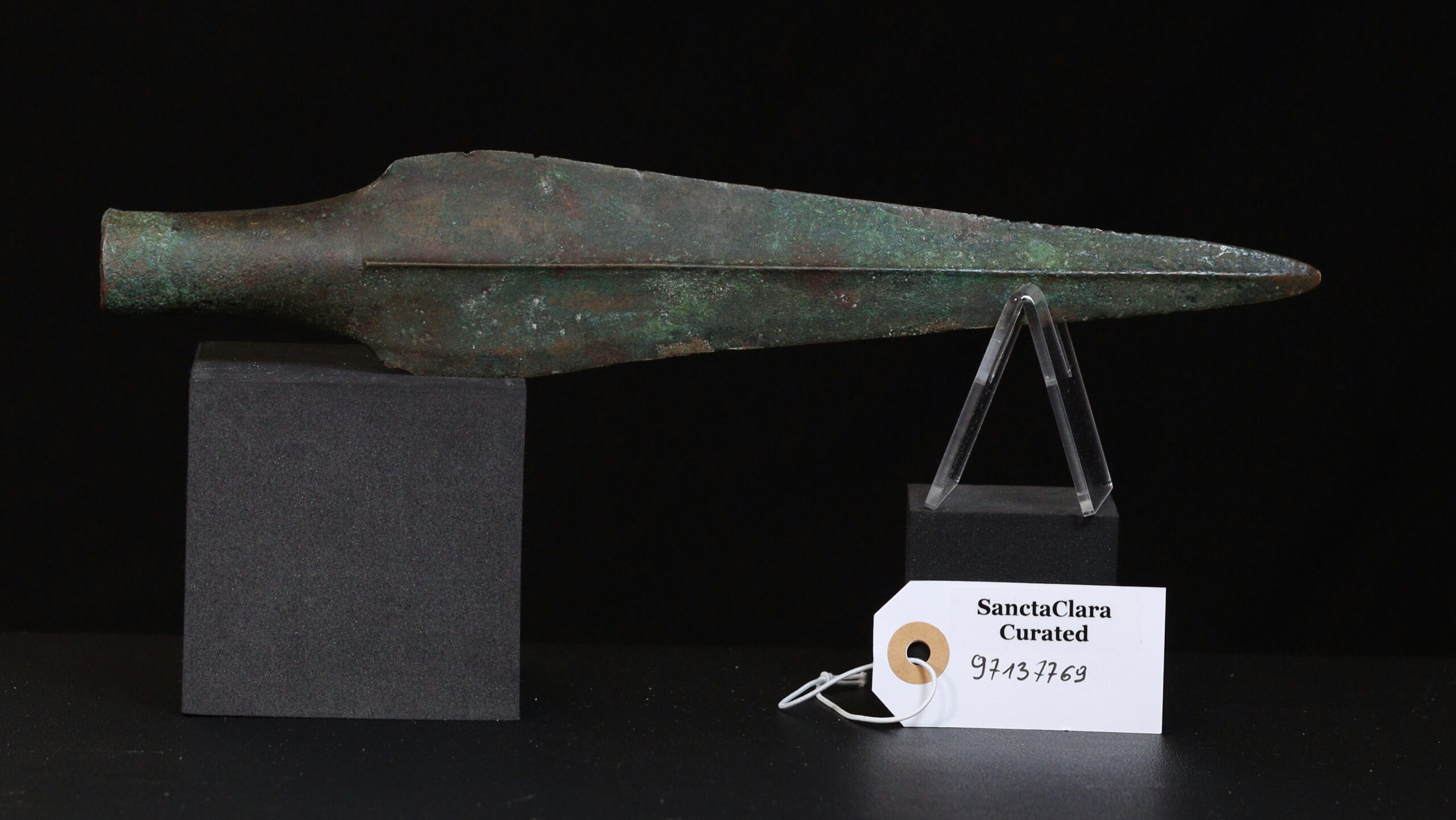 A large bronze socketed spearhead with a pronounced narrow midrib. Bivalve mould casting line visible at socket neck. Perfect condition with green patina, brown shading, and crystalline formations.
